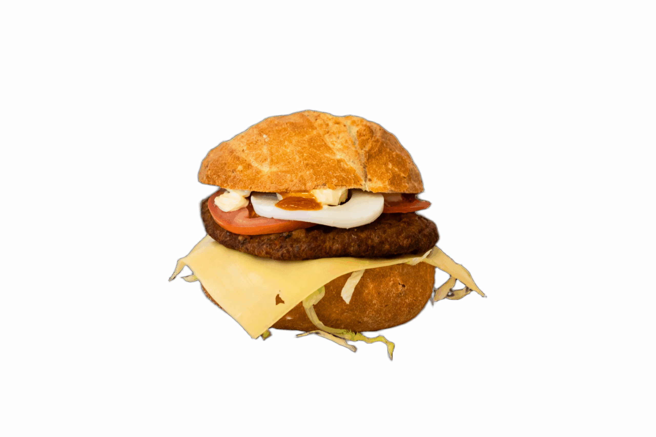 Overheerlijk broodje naar keuze, rijkelijk belegd met sla, uitjes, kaas, hamburger, tomaat, ei, mayonaise en curry.